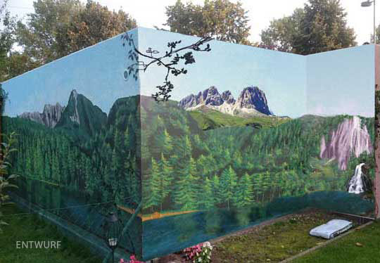 Gestaltungen die einem eine gezielte Illusion vermitteln sollen. Dies können z.B. Imitationsarbeiten wie, einen Holzzaun zu ergänzen, fehlerhafte Flächen in Fußböden (Holz, Beton, Fliesen) zu kaschieren, oder auch ein neuer See im eigenem Garten sein.